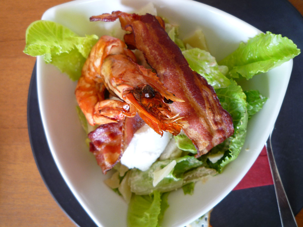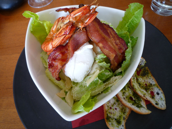 他的凱撒沙拉最大的特色是一支大蝦子、三片煎的香脆的培根三片蒜香羅勒風味的烤麵包,還有一顆半熟的水煮蛋。