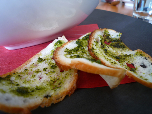 照片說明:烤得香脆有蒜香羅勒相的麵包。