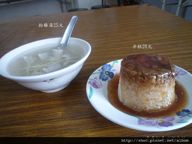 米糕,算是筒仔米糕。一份20元,會淋上店家自製的醬油膏跟番茄醬。是大人小孩都很喜歡的口味。