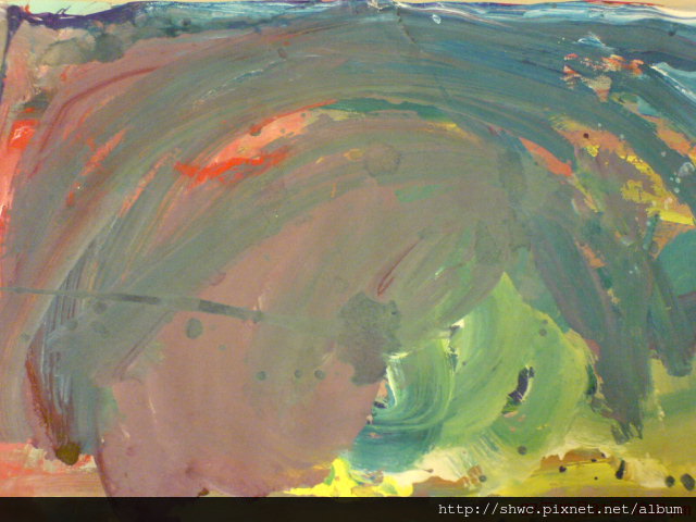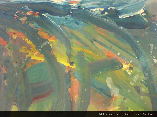 他跟我說:那一條條彎彎的是彩虹。紅紅的是太陽,藍色的是天空,綠色的是草原。