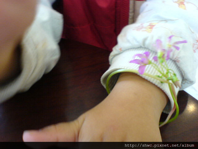我看他哭的很傷心,於是就摘了紫色酢漿草,編織成手環給他戴,他才破涕為笑。