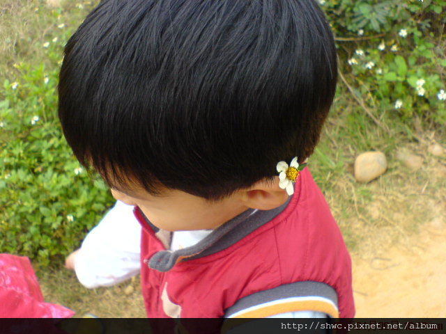 前幾天跟他外出散步,他就摘了一朵白色的小花別在耳朵上,還問我說:漂亮嗎?