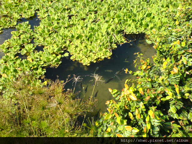 我們來的這天天氣很好,潺潺的流水中,浮萍蓮葉片片,魚兒隱身其中。