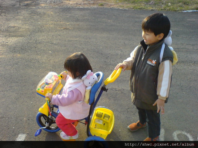 照片說明:妹妹你坐好!哥哥幫妳推車。