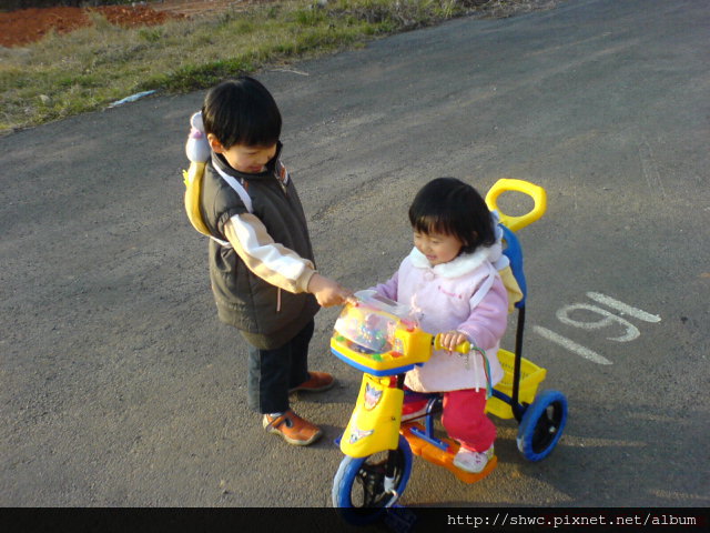小夏騎三輪腳踏車,小綠則是需用腳推的三輪車。