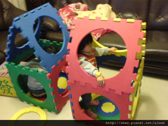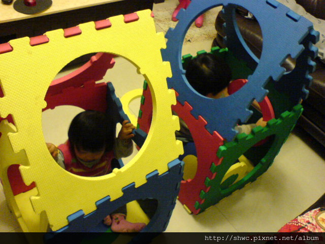而且我看他組合成隧道,讓小朋友鑽來鑽去很好玩。