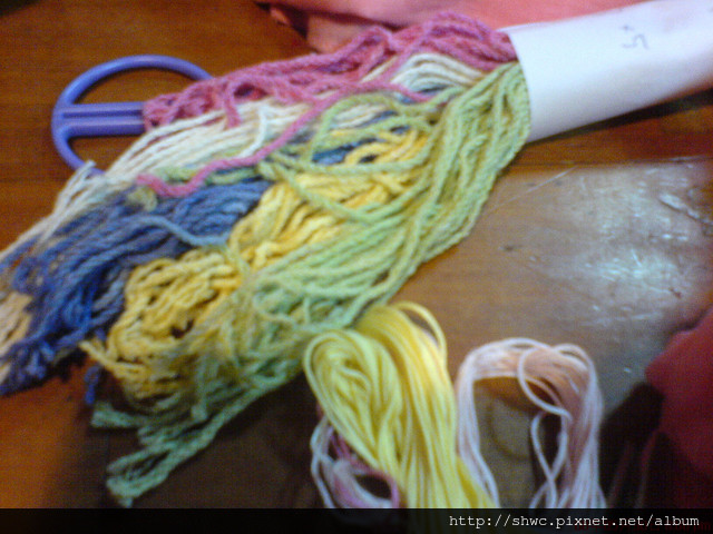老師準備了五色不同的羊毛線,有紅、黃、白、綠、藍。