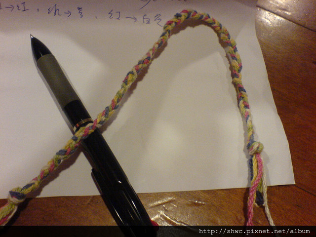 老師要我們先將五條繩子對齊,打上一個結。然後用腳的大拇指跟食趾夾住,開始動手編織。