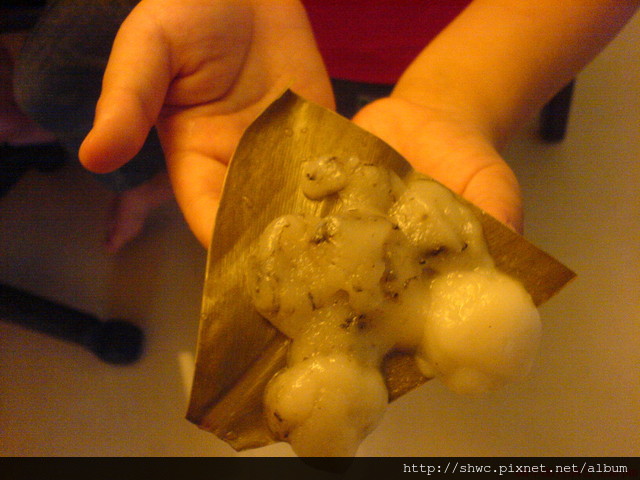 昨天接小夏下課,一回到家他很興奮地拿出他自己作的艾草粿。