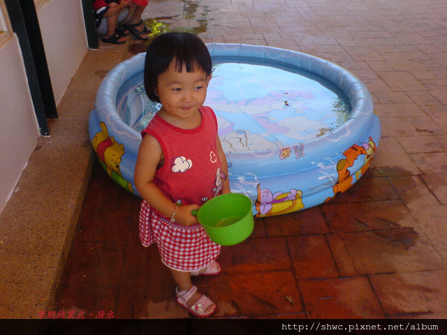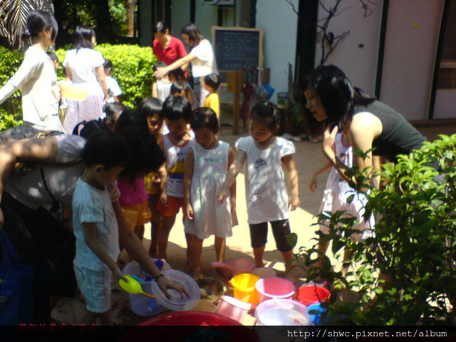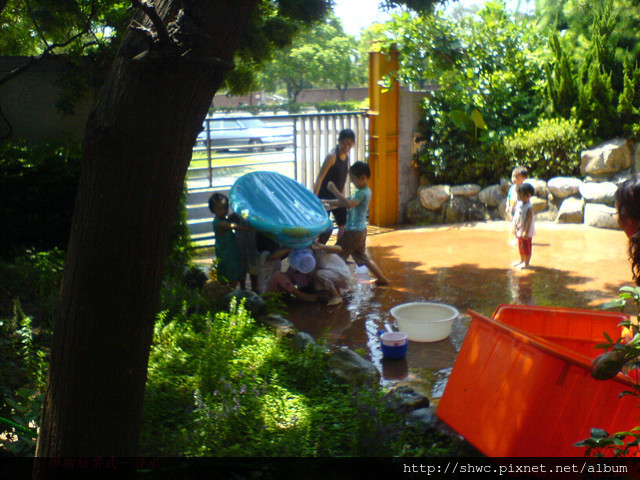 我看老師已經將小朋友帶來的各式澡盆及容器裝滿水。