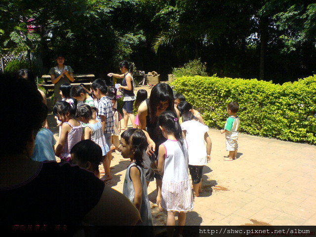 大家在廣場前圍個圈圈唱歌,老師將水撒在每個孩子身上。