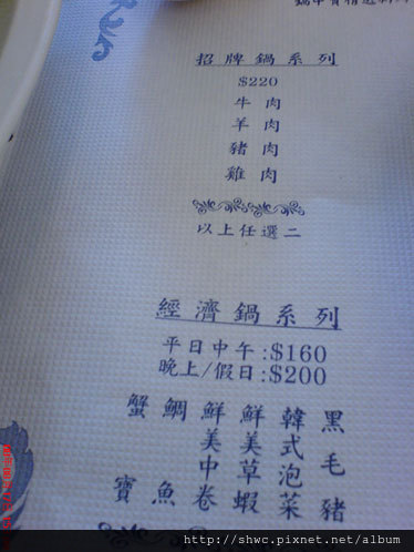 先來看菜單吧!店家有幾個經濟實惠的套餐供選擇。經濟鍋菜單下面還有外加一盤蛤蠣。