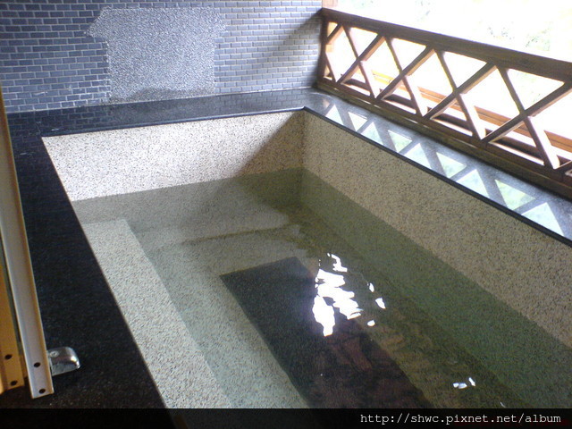 我們發現湯屋的池子有重新整理過。不止磁磚換成珉石子,加上一道小斜坡,連出水口都換邊了。