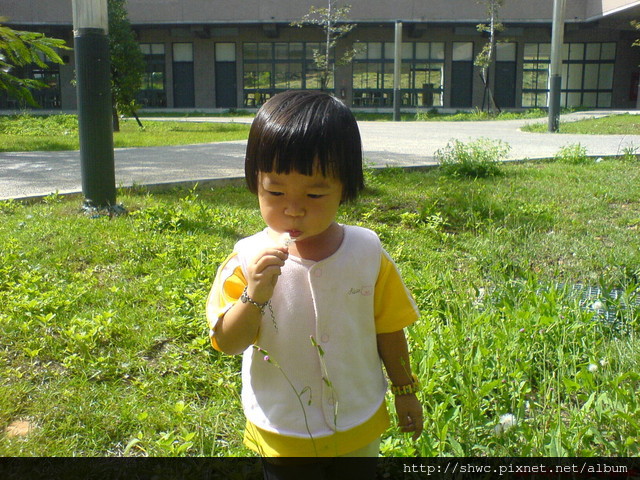 我們在學校裡走走逛逛,小綠很高興地發現草叢中的嬌客,還摘了一朵花送給哥哥。