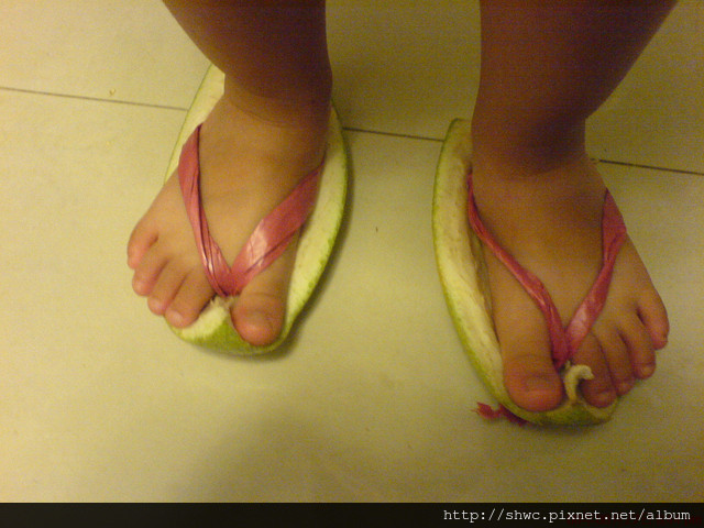 柚子皮除了可以當帽子,曬成乾可以防蚊跟煮茶外,還可以做成鞋子。
