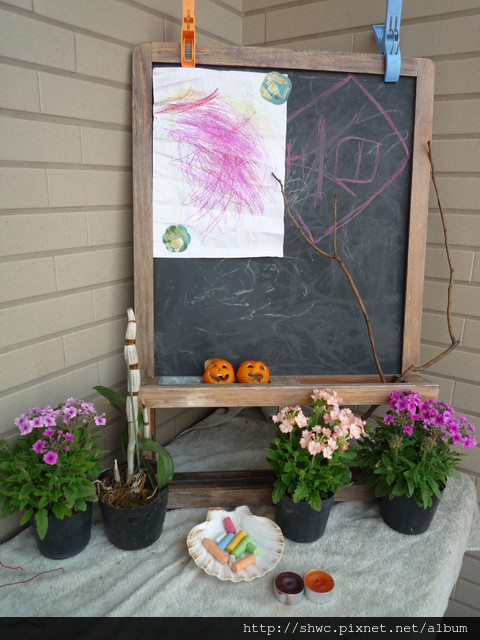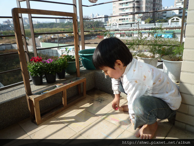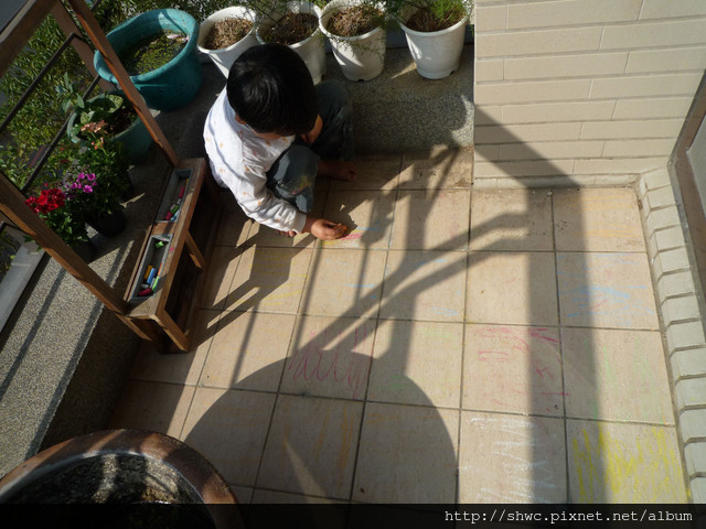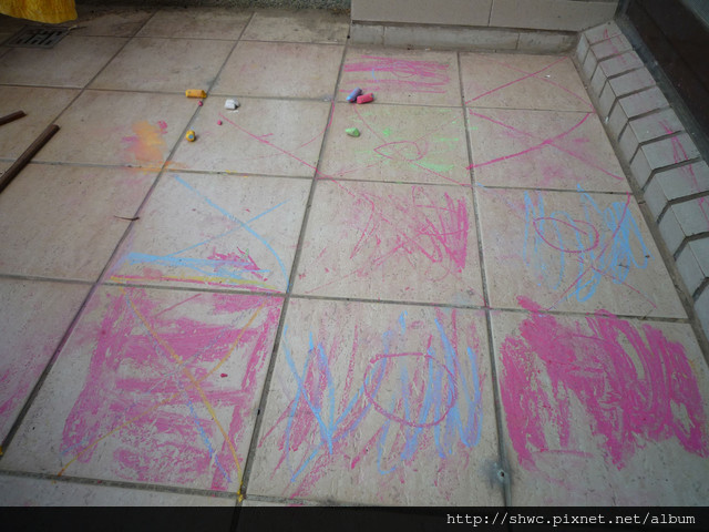 我也拿出好幾色的粉筆,讓小朋友可以自由地在陽台作畫。