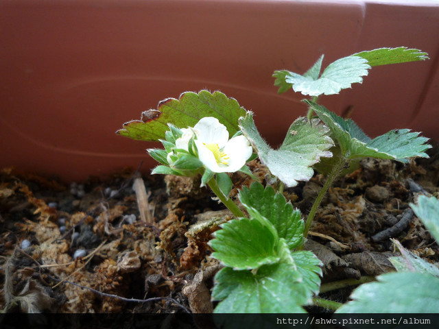去年年終在泰安買的兩盆草莓,也開了小小的白色花朵,小朋友很興奮!期待家中的第一顆草莓出現。