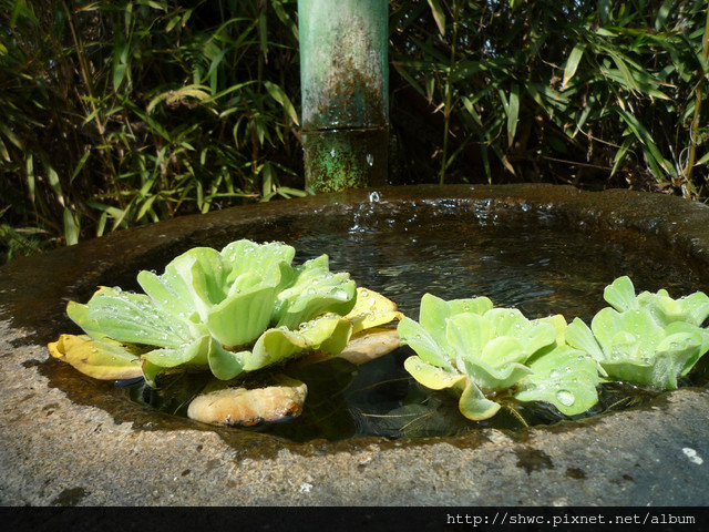 湧泉的水滴在水盆,濺起的水珠把水面的植物妝點得很漂亮。