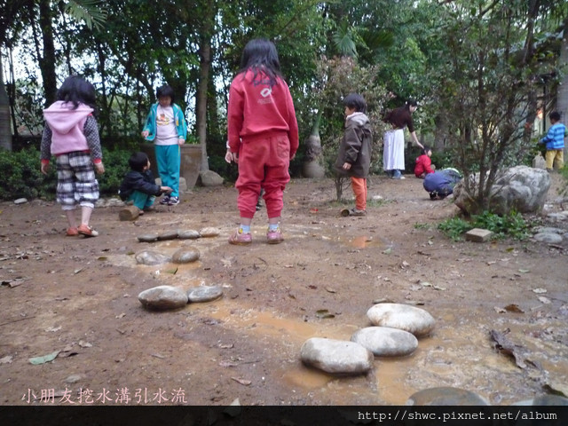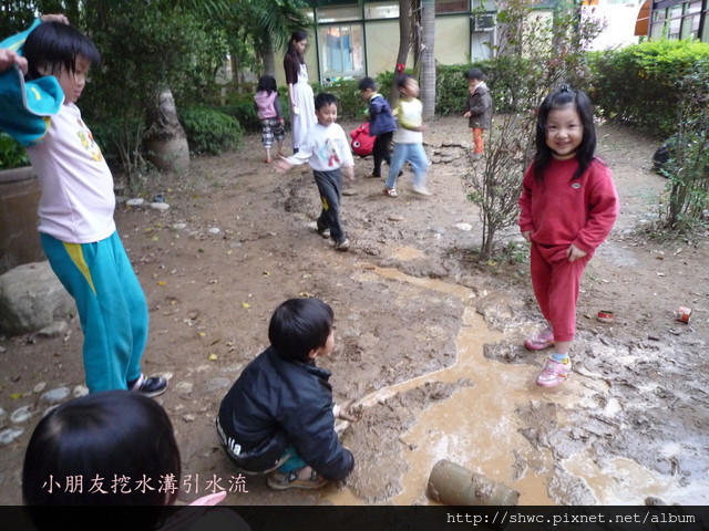 這時候又有小朋友開始拿工具挖溝渠,讓水可以沿著溝渠流到排水孔。