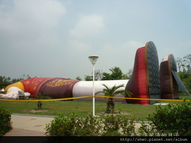 真的是好大的一個充氣人偶阿!可能還沒完成準備作業,所以現場圍起封鎖線,只見工作人員忙進忙出的。