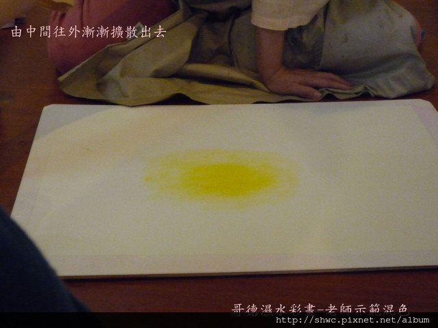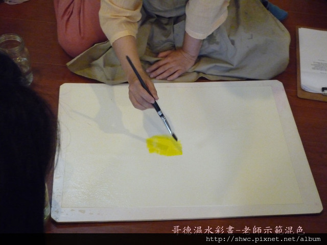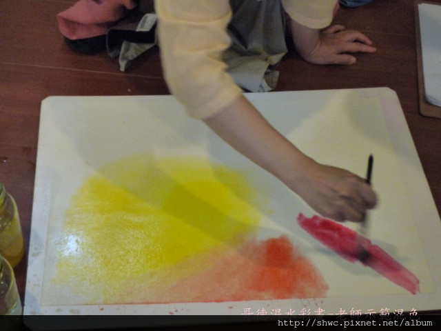 混色前有幾個重點,第一個是畫紙的濕度。第二個是要保持水瓶跟筆的乾淨。第三個作畫要輕輕畫,像搔癢一樣的力道。