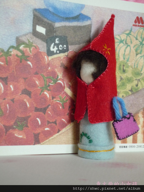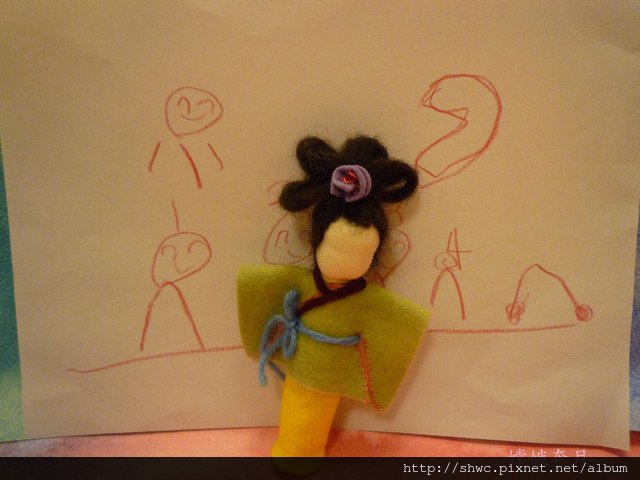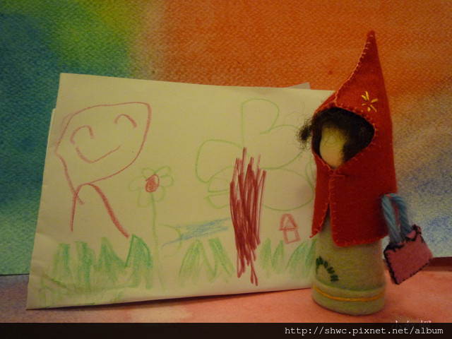 昨天小夏一下課看見他,就說他是賣火柴的。我就請小夏畫了小紅帽的故事背景,然後拍照,感覺很有趣耶!