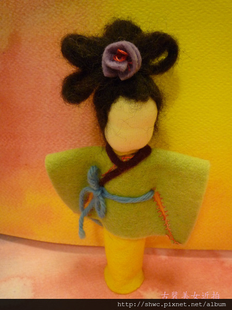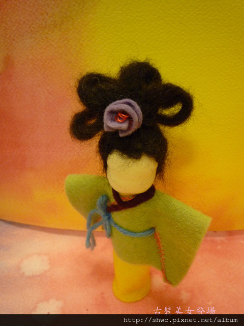 結果我發現要將這些羊毛條固定在頭上比較不容易。因為我手藝不巧阿...所以光是頭髮就搞很久,尤其是古裝的。