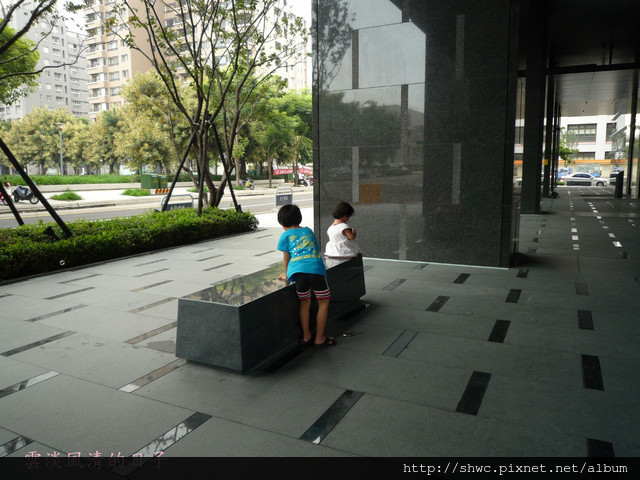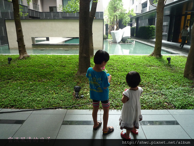 這幾天天氣非常熱,連公園的溫度也非常的高。雖然躲冷氣房是最舒服的選擇,但是也總得讓孩子出去透透氣吧?於是就帶著兩個孩子下樓吹泡泡。在中庭的水池吹泡泡,看見泡泡在水面奔馳,看著泡泡破滅。有風的時候,坐在大廳外的椅子上,只需要揮揮手就可以產生很多泡泡。有風,有水,體驗夢想飛馳的樂趣。這也是幸福阿!