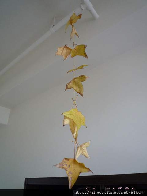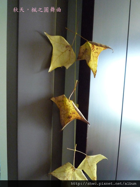 我將楓葉兩兩地串在一起,在風吹過的時候,就像兩個人在跳舞一樣。