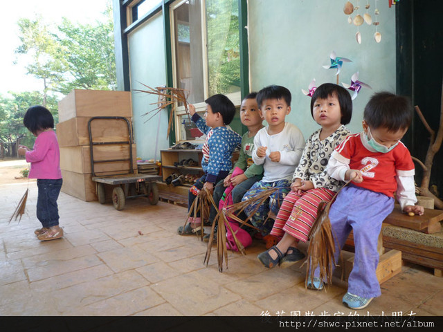 看他們一起坐在大班外面的板凳上,等老師拿水果。