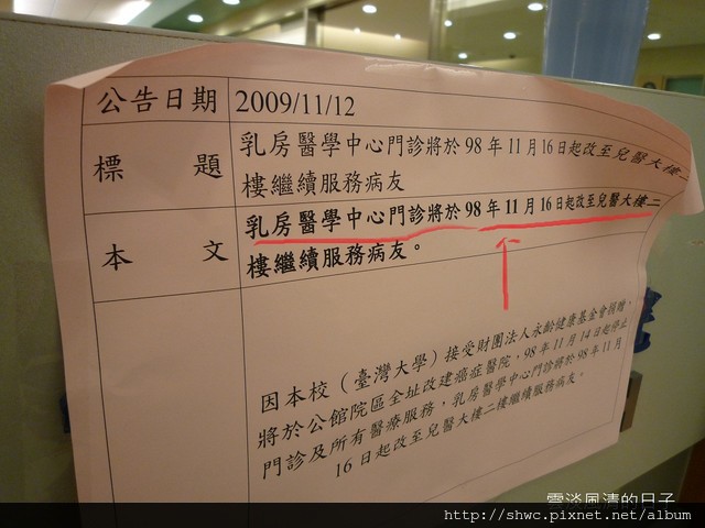 在服務台意外看見乳醫中心搬到兒醫二樓的公告!幸好有看見阿,不然我回診大概又要迷路了!