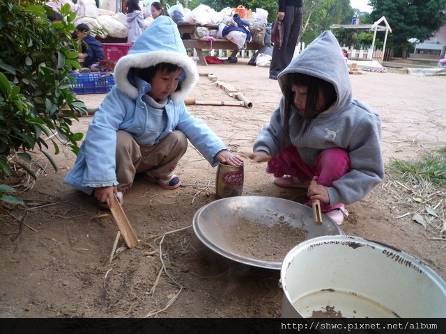兩個小女生不曉得在煮甚麼好料?有沙子,有台灣欒樹,看來應該是很道地的台灣小吃。