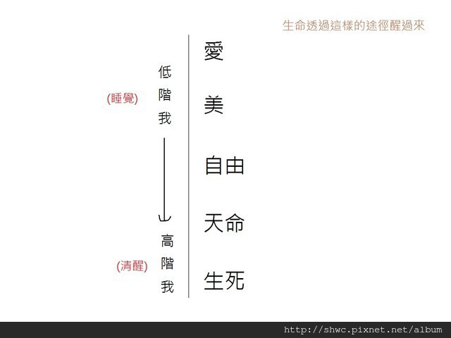 關於愛,美,自由,天命與生死的課題,都是要靠"我"有意識地去體驗,這樣才能提升自我。