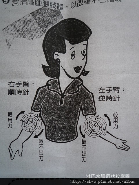 7.按摩時以環狀按摩,右手臂以順時針方向,左手臂以反時針方向,由下往上按摩。由下往上時出力,由上往下時力道小一點。