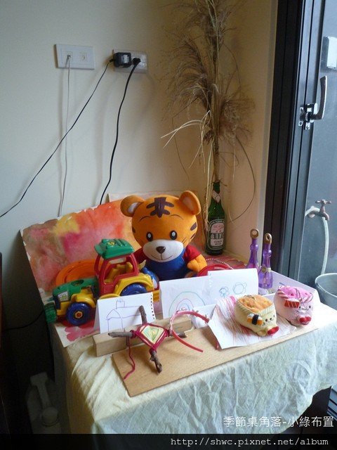剛跟兩個孩子說那是季節桌的位置,小綠馬上搬東西過去布置。