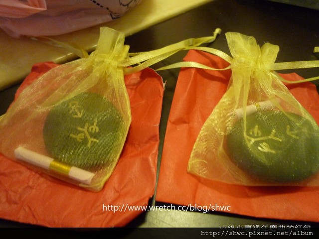 小紅包裡面有一個金色的網袋,裡面有一顆黑色的圓的石頭。
