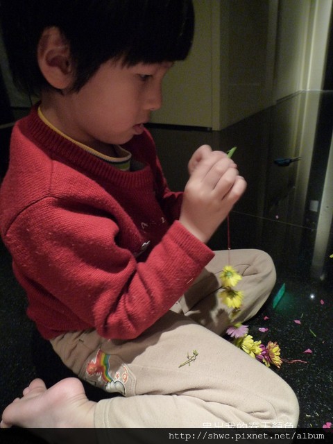 我就將針串好線,幫他準備幾朵小菊花後就交給他自由發揮。