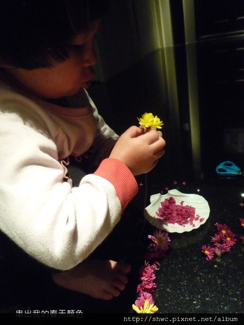 我馬上又剪了一些菊花給兩個小寶貝動手。