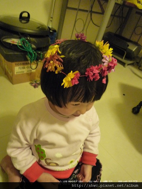 小綠妹妹則是仔細地調整每朵花的距離,最後還把他圍成花冠戴在頭上。