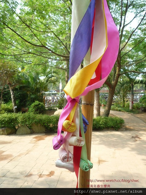 小廣場前矗立了一根高高的竹竿,上面垂下各色的絲帶。