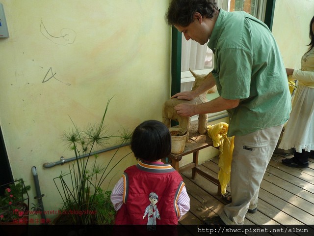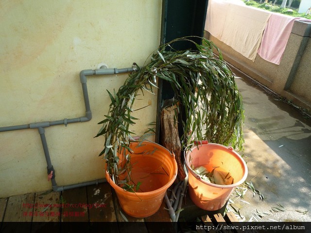 老師忙著幫日曬後裂開的春牛補土整形,還有將慶典要用到的柳枝清洗乾淨。