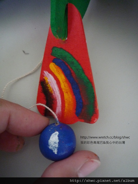 拉繩的小球讓我聯想到地球,我將球塗成藍色畫上一個台灣還有一個大愛心,表示我愛台灣。