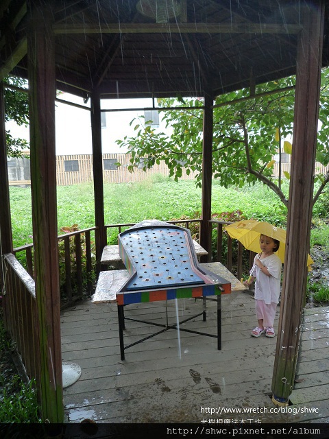 雖然雨很大,可是兩個孩子還是興致勃勃地在雨中玩起大彈珠台。