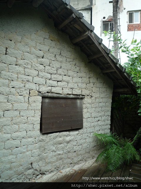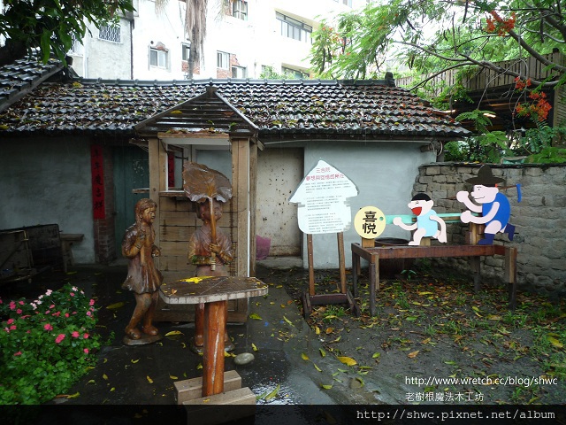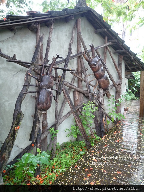 三合院旁邊種植美美的使君子跟鳳凰木,在步道的牆面用木頭做出了兩隻獨角仙。