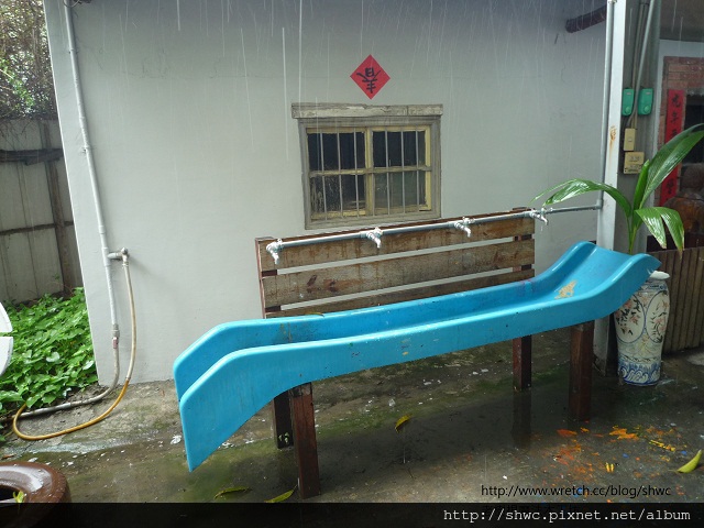 有趣的是水龍頭下方是溜滑梯改裝,很符合整個童趣畫面的規畫。