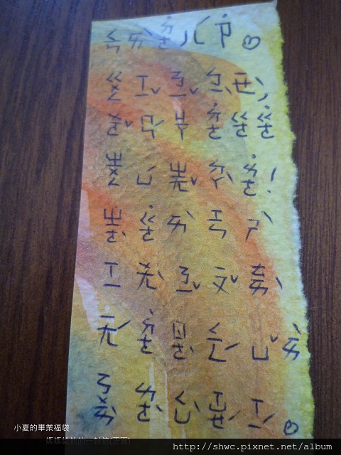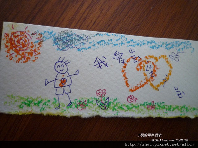 媽媽我也用注音符號寫了一封信給他。背面畫上一個小男生,寫著我愛這個世界。