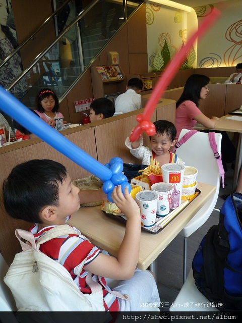 剛好服務員作了兩支氣球寶劍給小夏跟小綠,就在此好好休息一下吧!