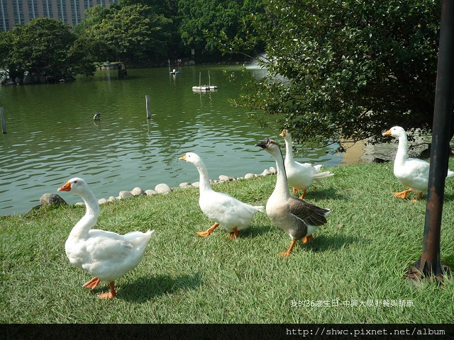 在繞湖一周的過程中,看見剛上岸的鵝正抬頭挺胸的散步。