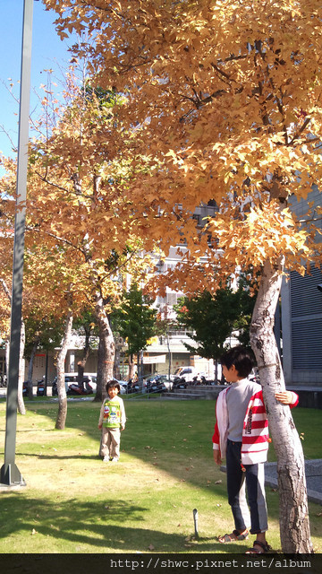 帶兩個孩子走路去吃早餐的過程中,意外發現好幾株金黃色的楓葉。