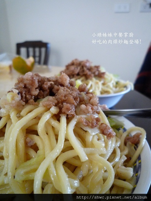 上桌了!今天的惜福肉燥炒麵,謝謝小綠妹妹的招待。